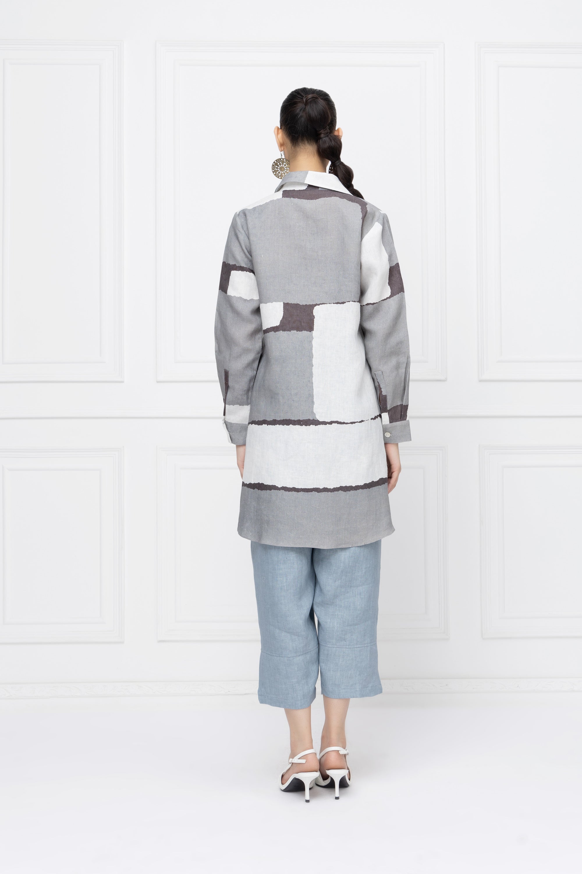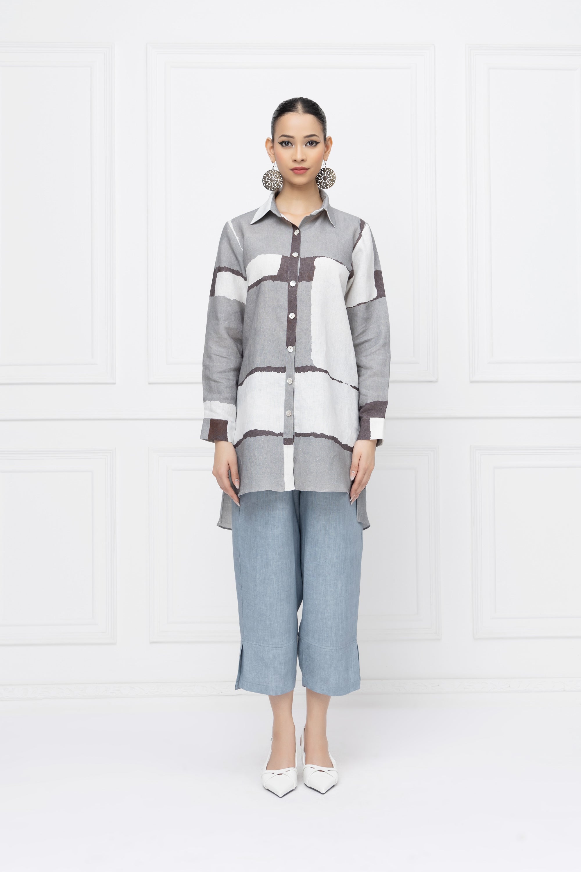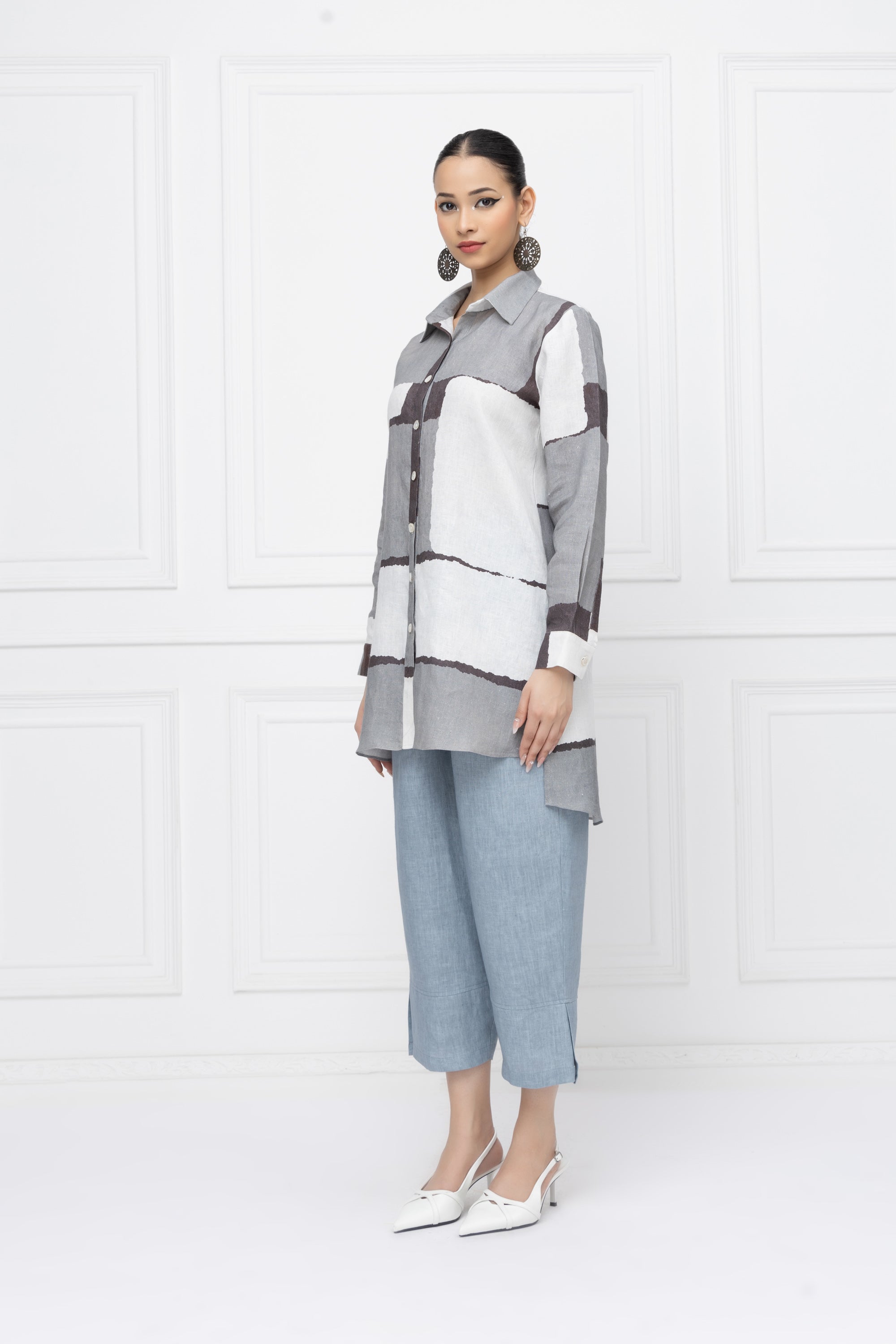 Our monochromatic hand-painted shirt top features a slight high low detail. Front open with shell buttons.