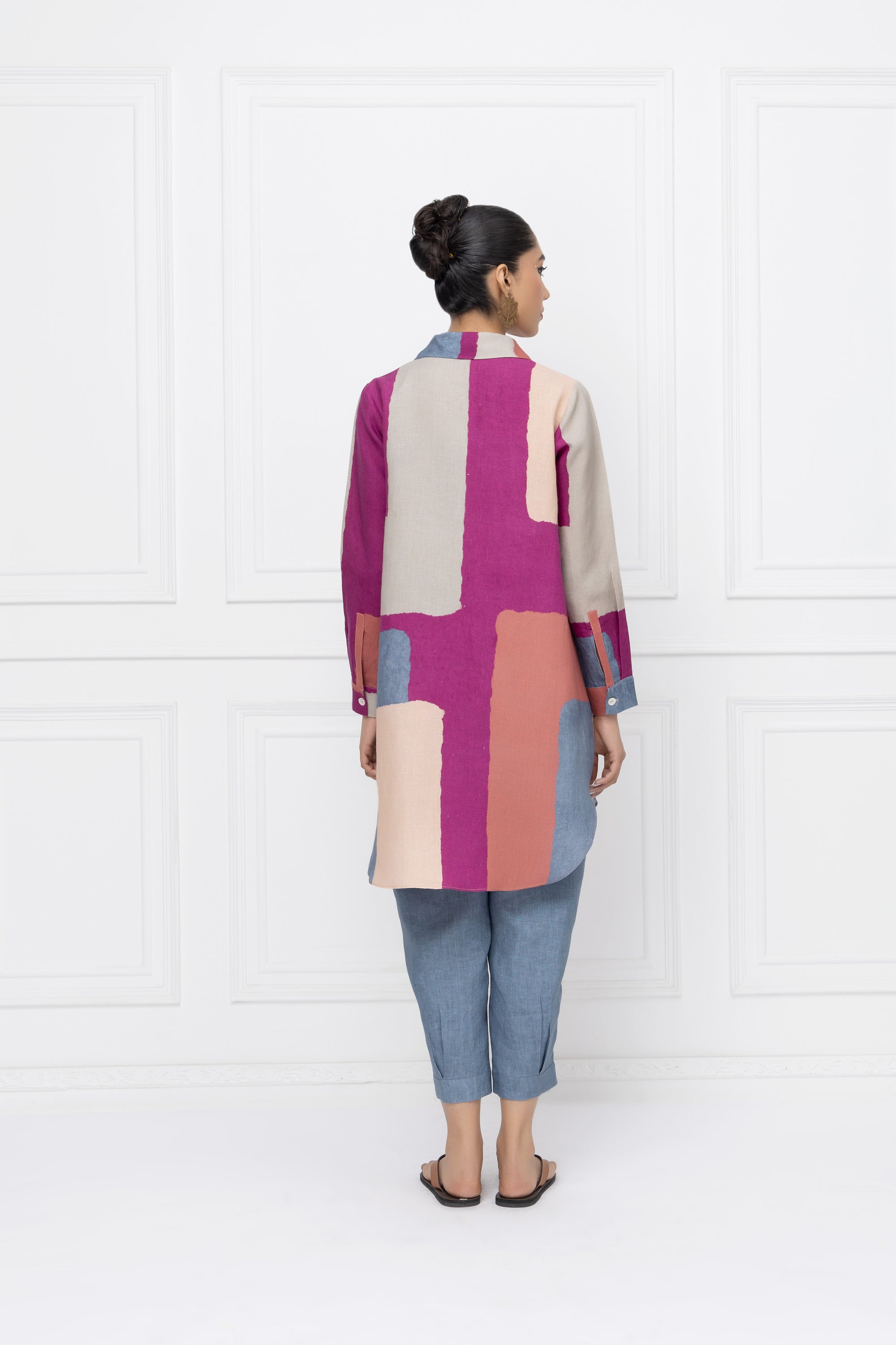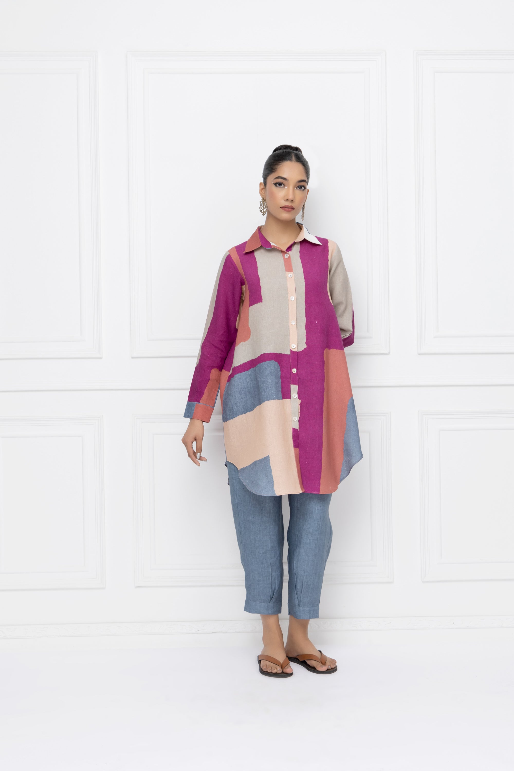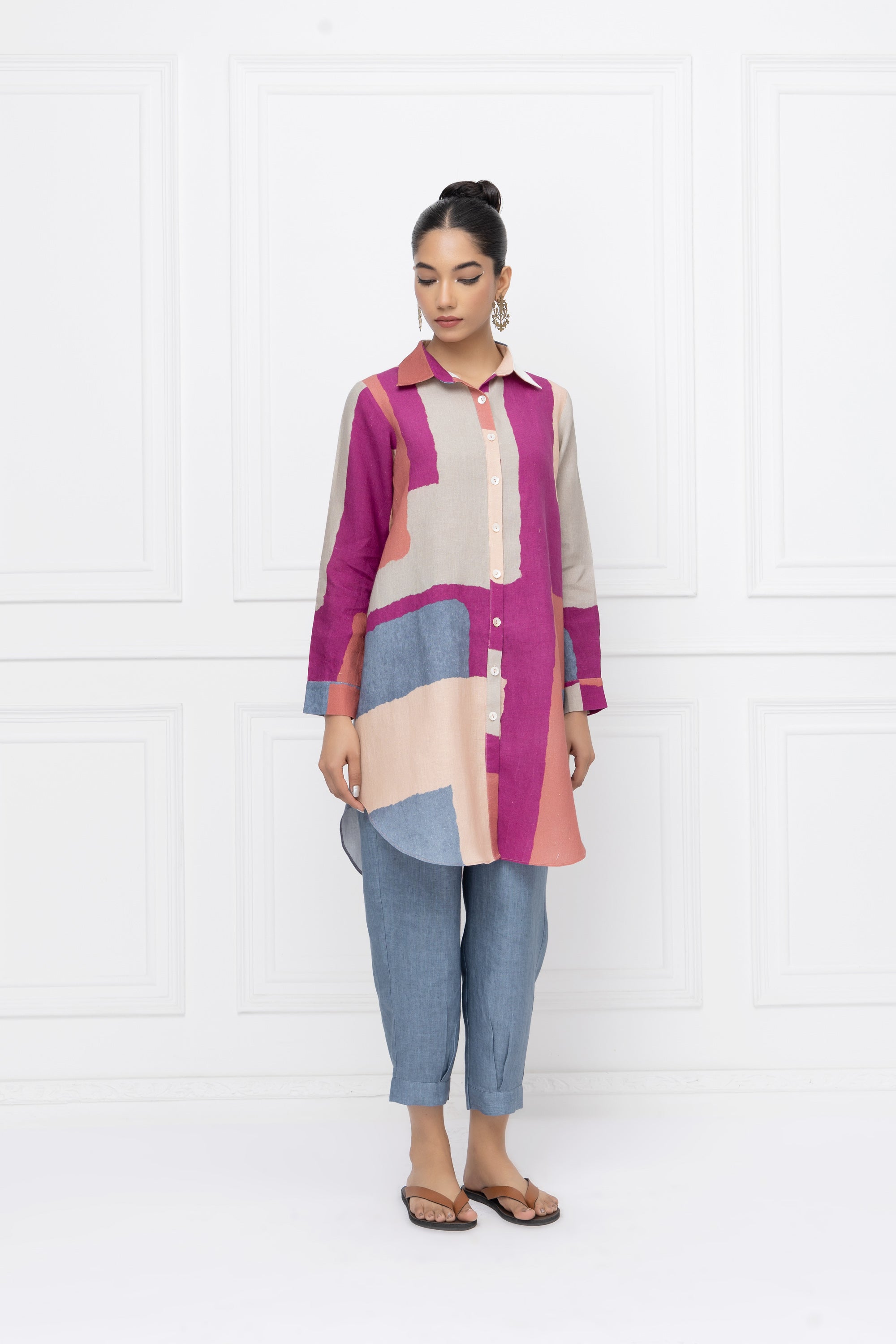 Our hand-painted print in feminine shades of pink, shirt collar, front open & straight sleeve. This top has been designed for a comfort fit with a curved hemline for an elevated look.