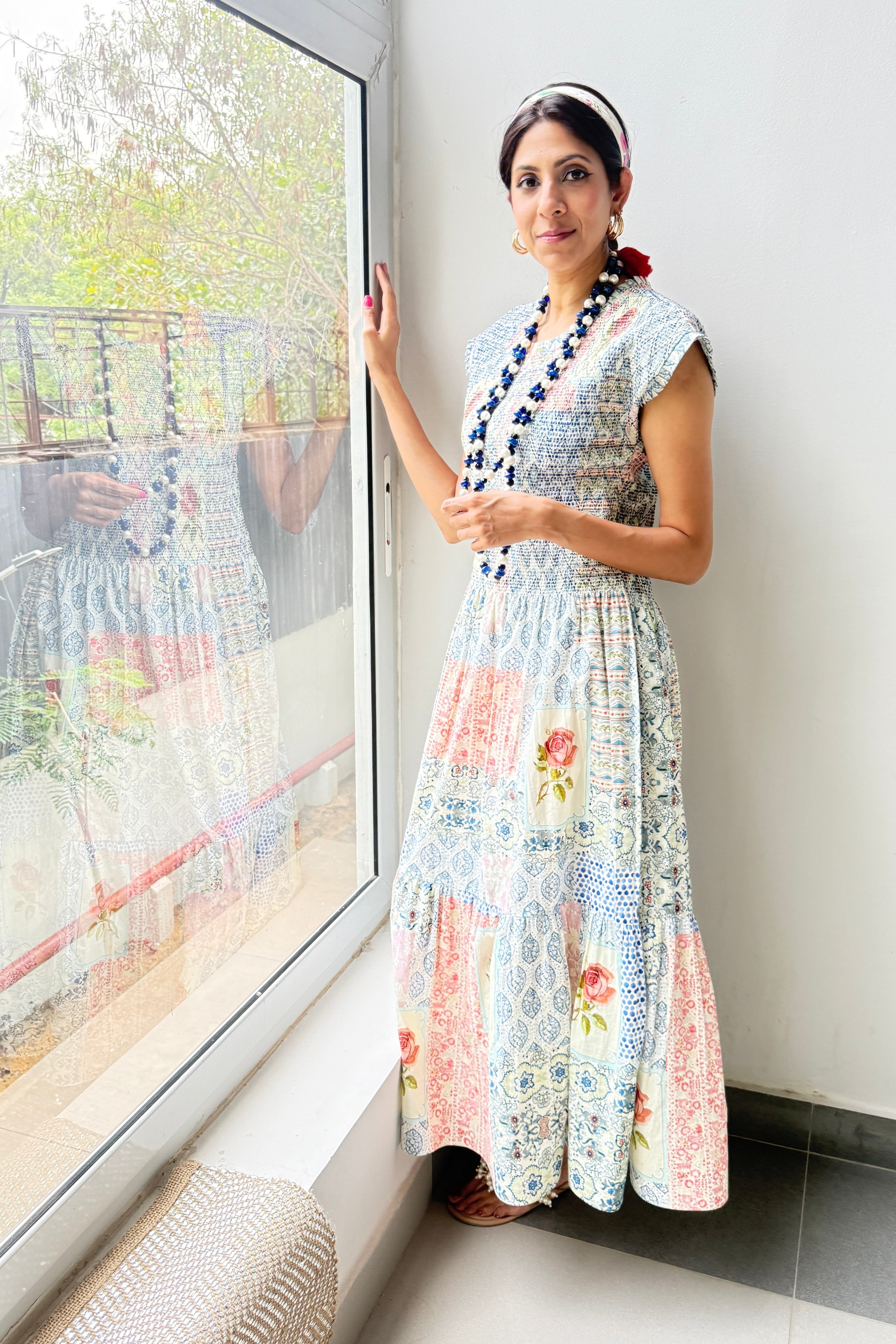 Smocking detail bodice, gives a comfort fit without being body hugging. Maxi length for hot summer days in our signature cotton. Cap sleeve detail.